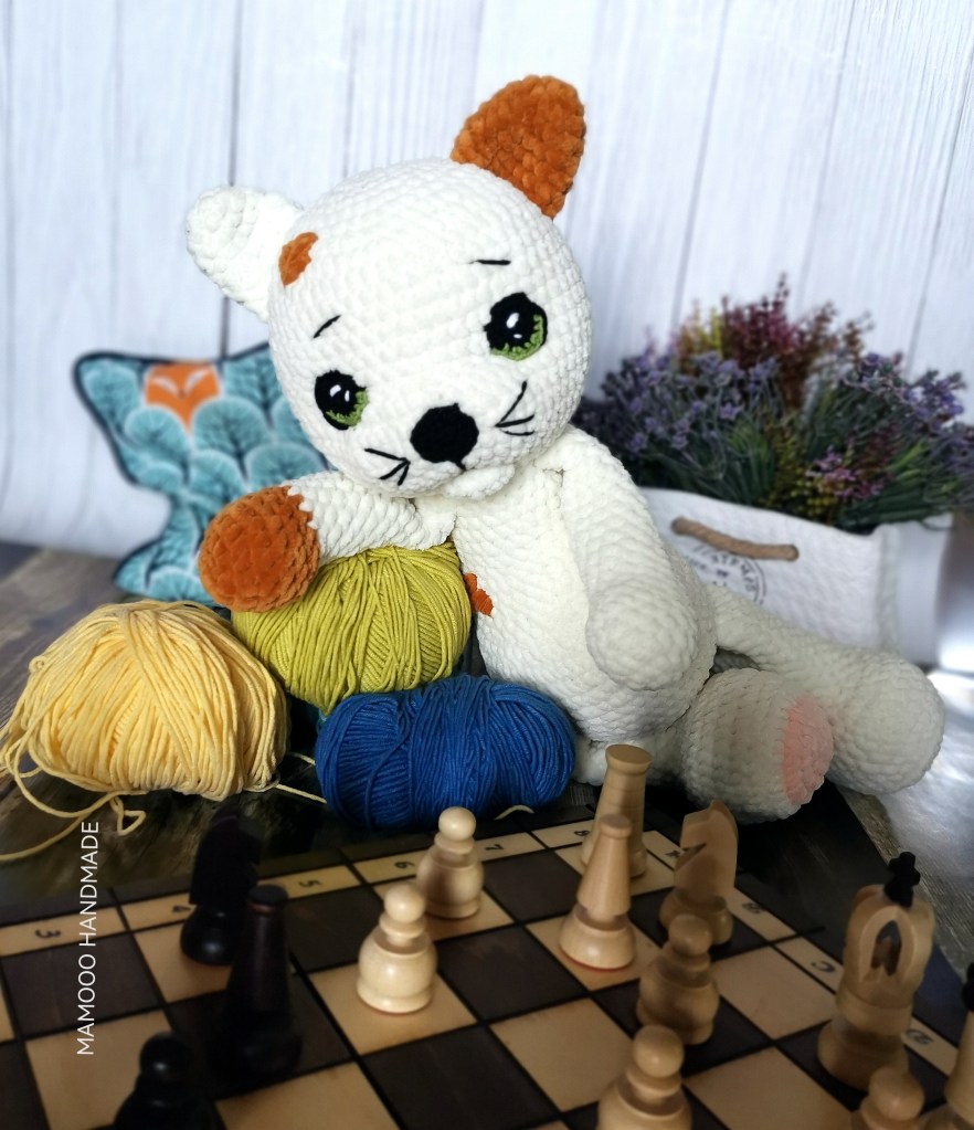 Do gry w szachy potrzeba cierpliwości, skupienia i ogólnej bystrości umysłu, a mój kotek chyba wolałby gonić za kłębkami włóczki😻 Oto najnowsza maskotka na szydełku : kotek FILEMON💙 Kremowy szydełkowy kotek w rude łatki🧡 Boisz się, że będzie się brudził?😉 Moje szydełkowe maskotki można bezpiecznie prać w pralce temp 30 stopni – wszystkie elementy są dobrze przyszyte i nie ma żadnych elementów plastikowych, bo oczy i nosek są wyszyte włóczką ❤️ Filemon ma ok. 38cm wysokości, wykonany jest ręcznie szydełkiem z mięciutkiej pluszowej włóczki i wypełniony antyalergiczną kulką silikonową 💜 Jest uroczy🥰🥰🥰