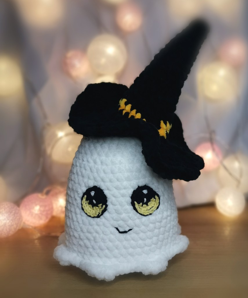 Duszek ma przyszyty kapelusik i można tego słodziaka – tak jak wszystkie moje maskotki – spokojnie prać w temp 30 stopni. Co do wielkości to sam duszek ma 14cm,a z kapelusikiem 24cm.