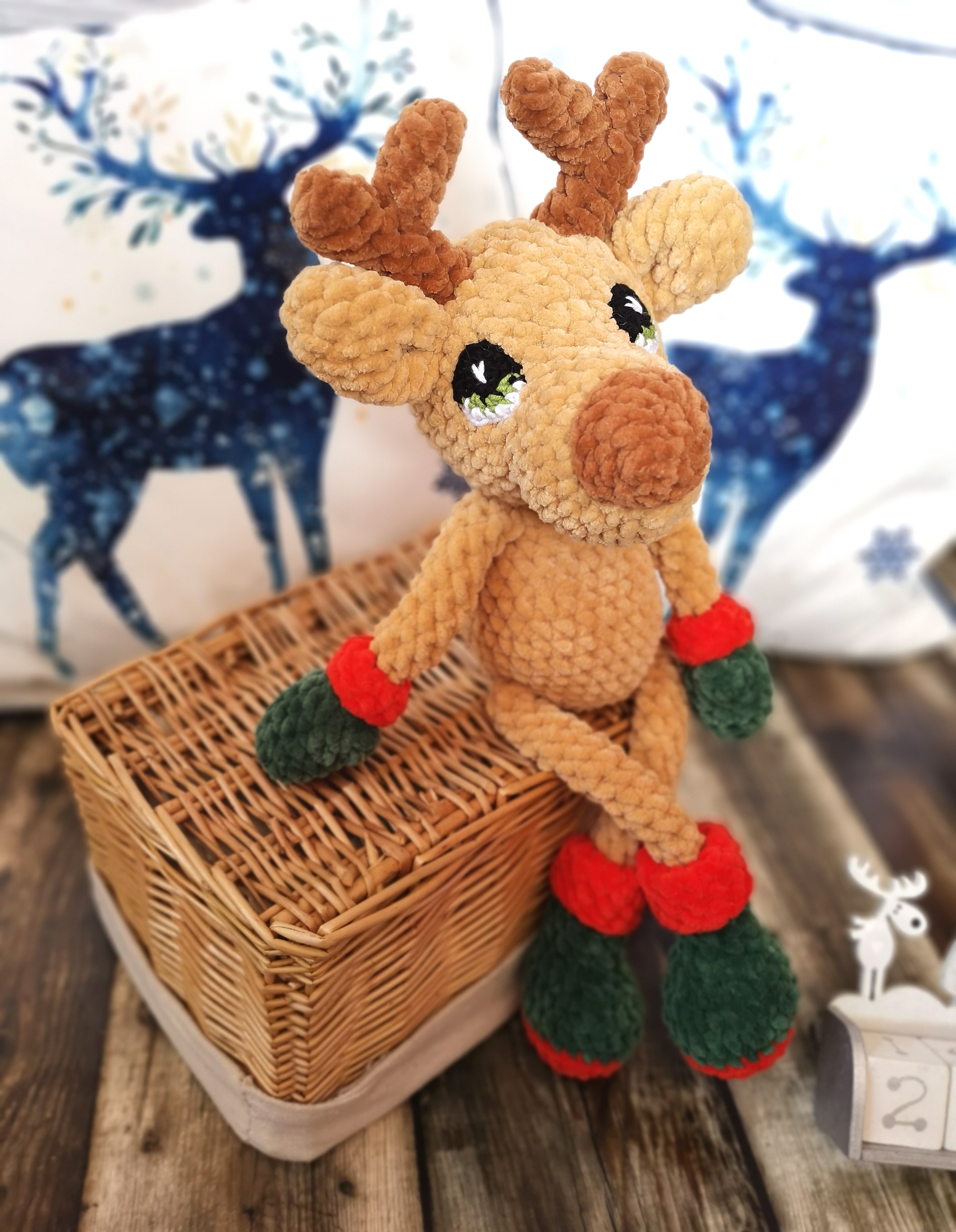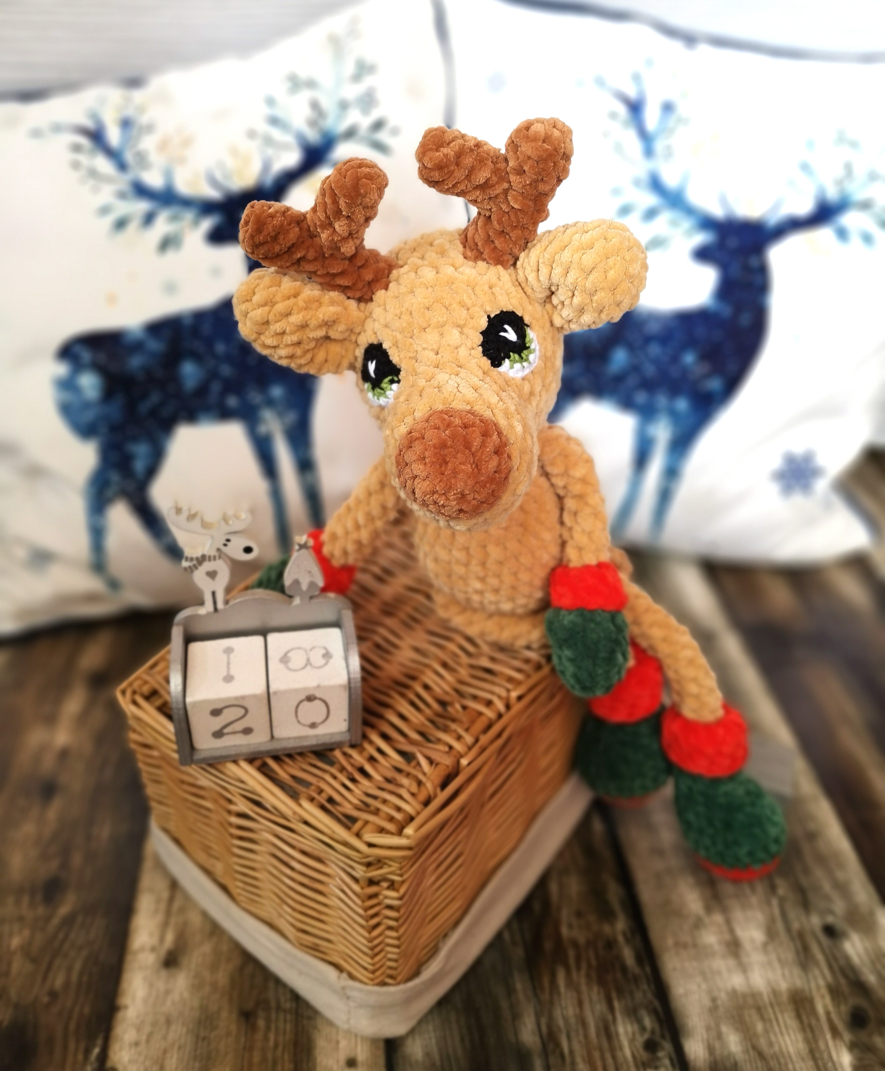 Renifer w rękawiczkach – włóczka pluszowa, wysokość ok. 35cm. Cena 149zł