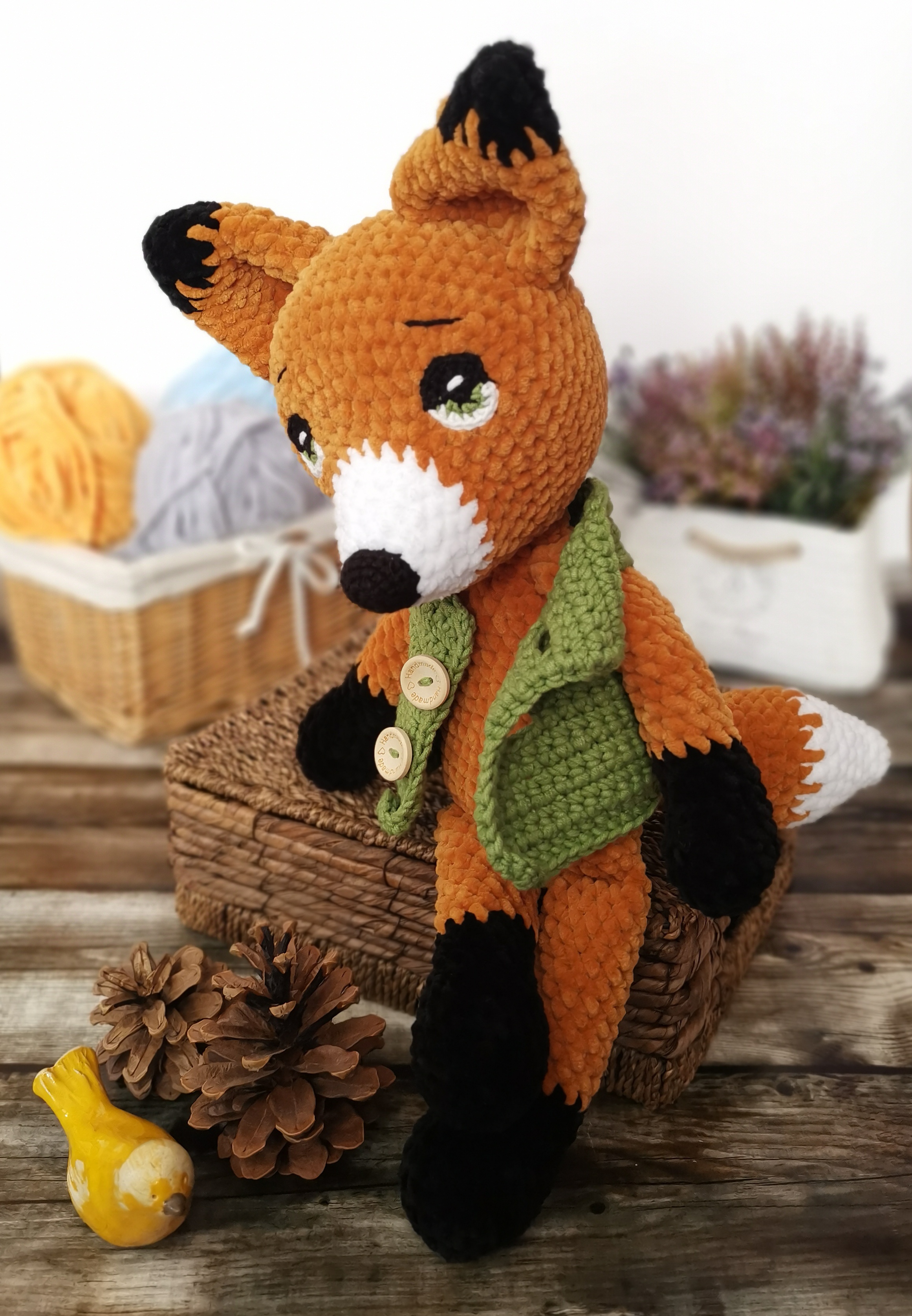 Lis Fryderyk – wys. 38cm, włóczka pluszowa (lisek), włóczka bawełna + akryl (kamizelka jest zdejmowana), 2 drewniane guziki. Cena 199zł
