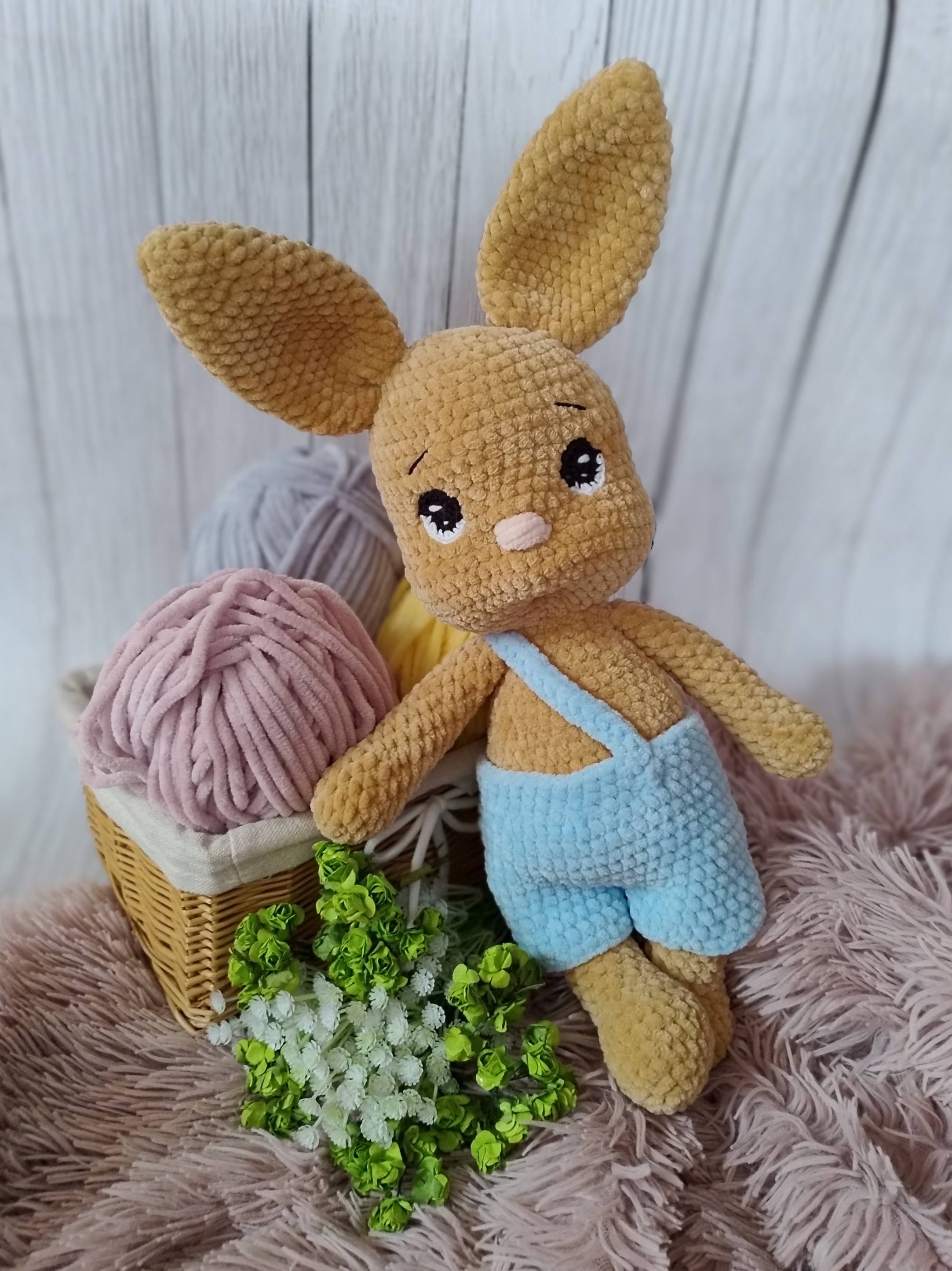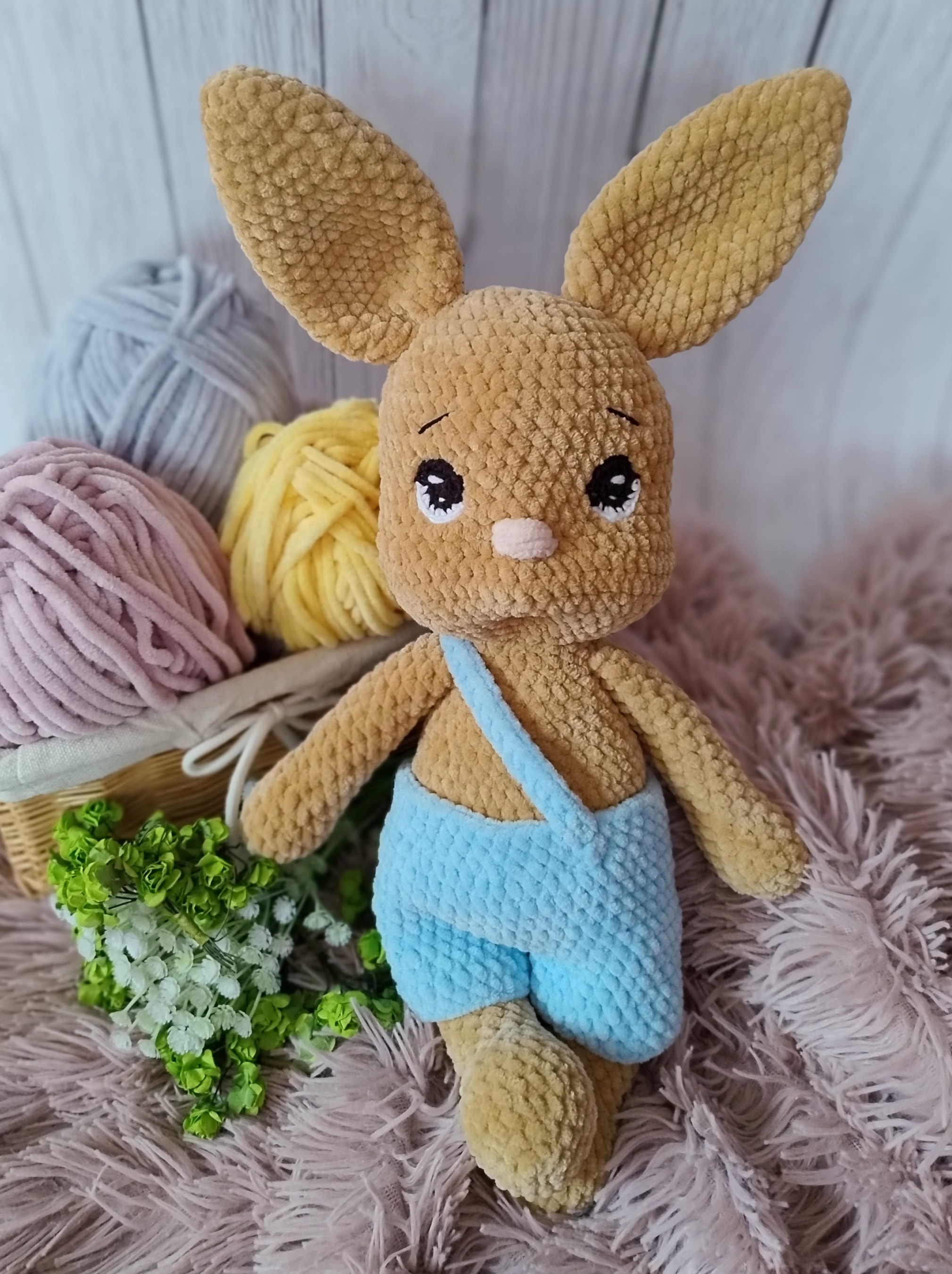 ZAJĄC ROMEO – włóczka pluszowa, wys. ok. 37cm z uszami. Dowolna kolorystyka ubranka. Cena 150zł