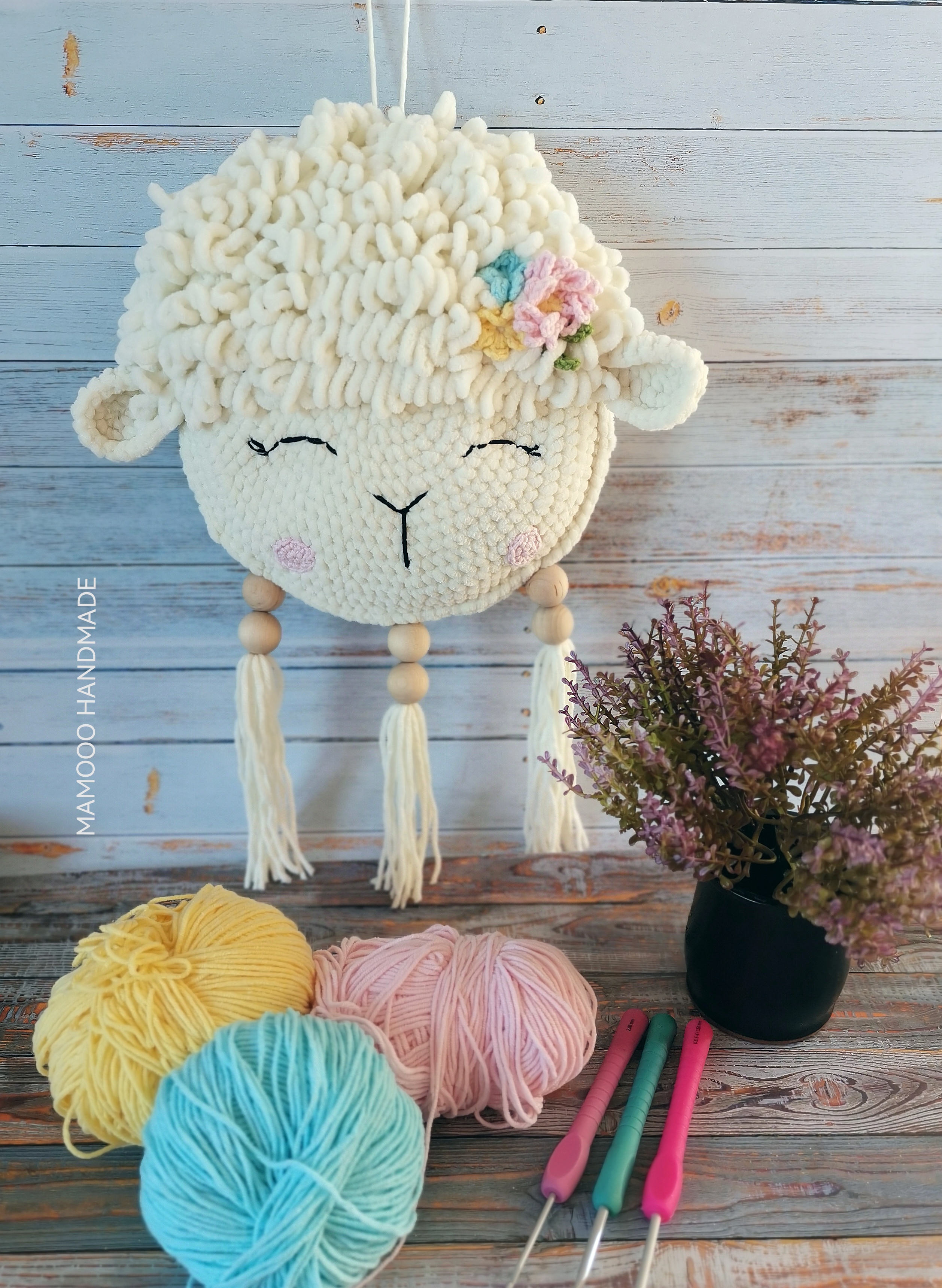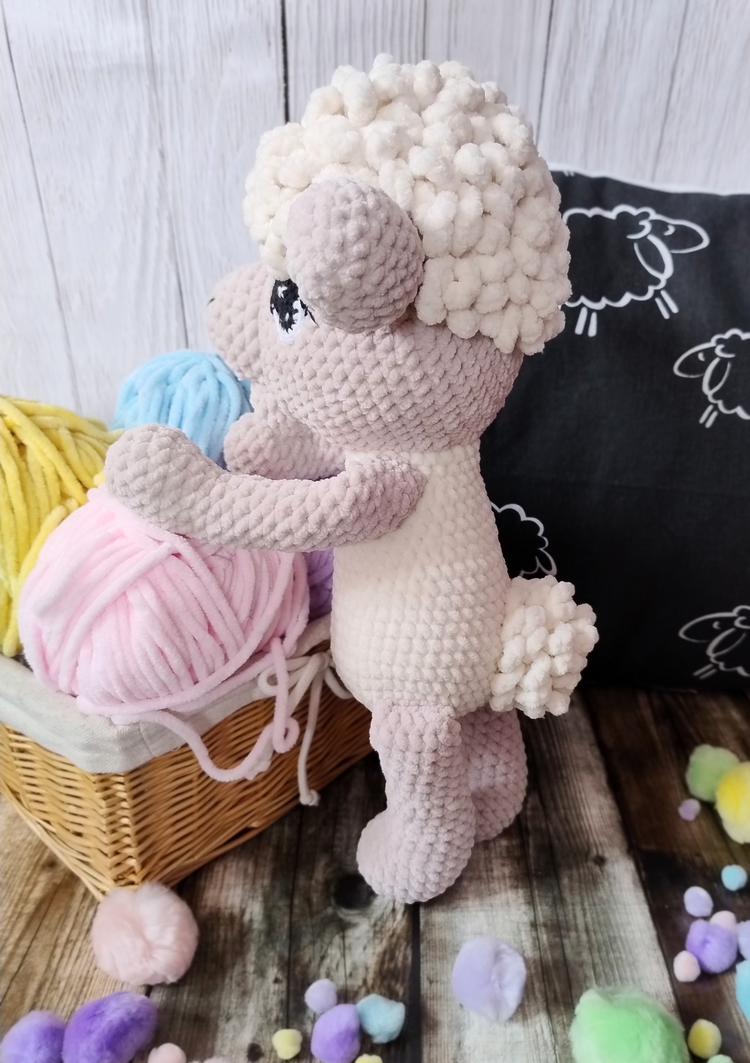 OWIECZKA – włóczka pluszowa, wys. 37cm, pracochłonna ale efektowna grzywa i ogonek. Cena 210zł