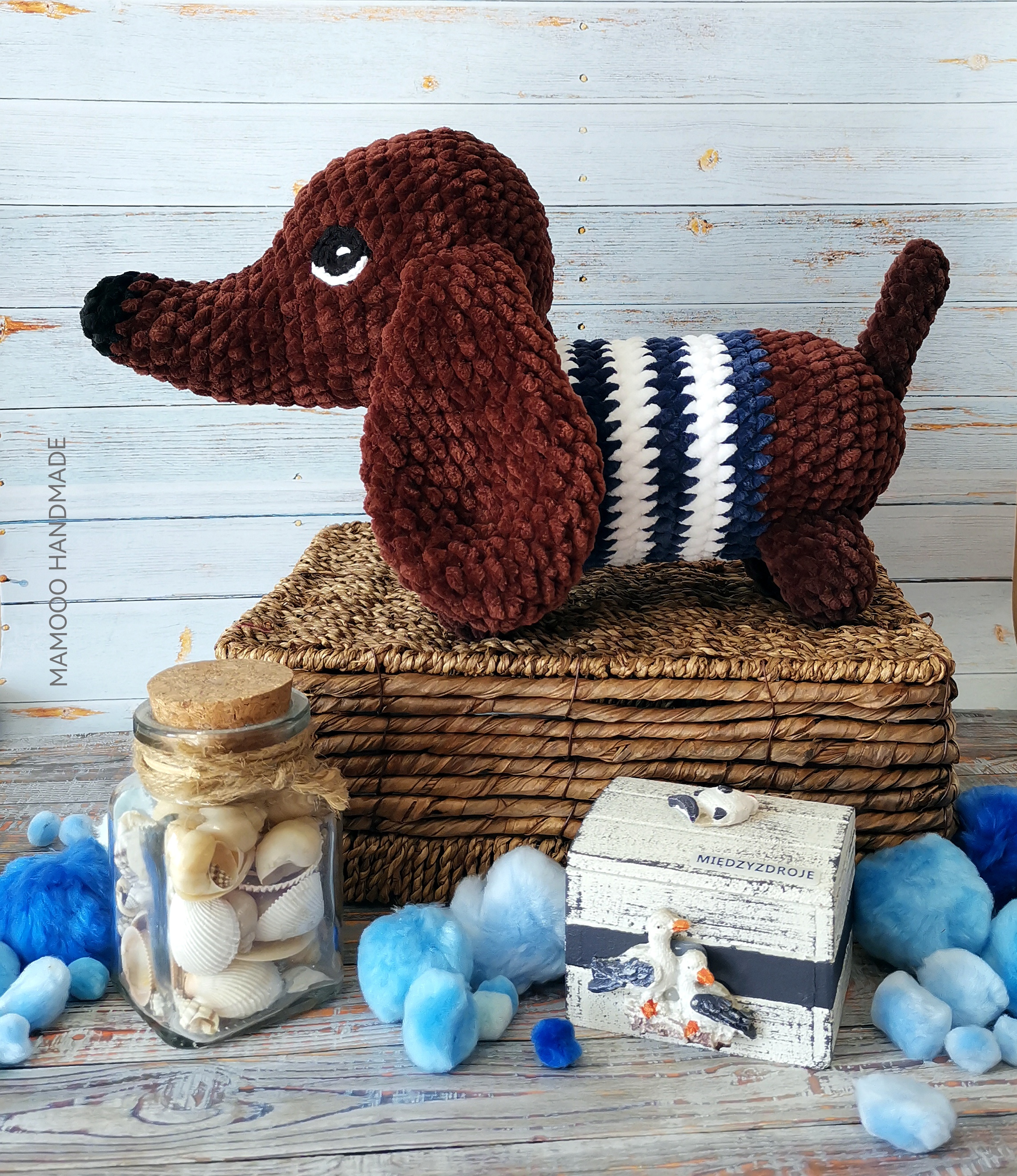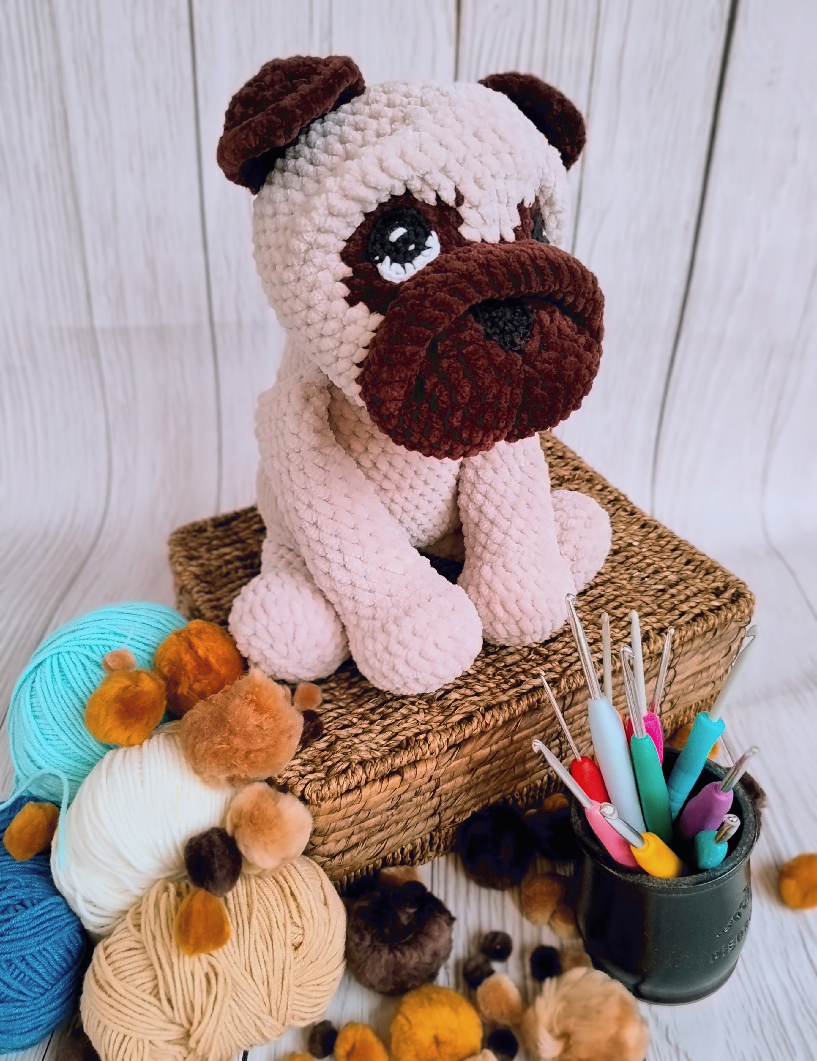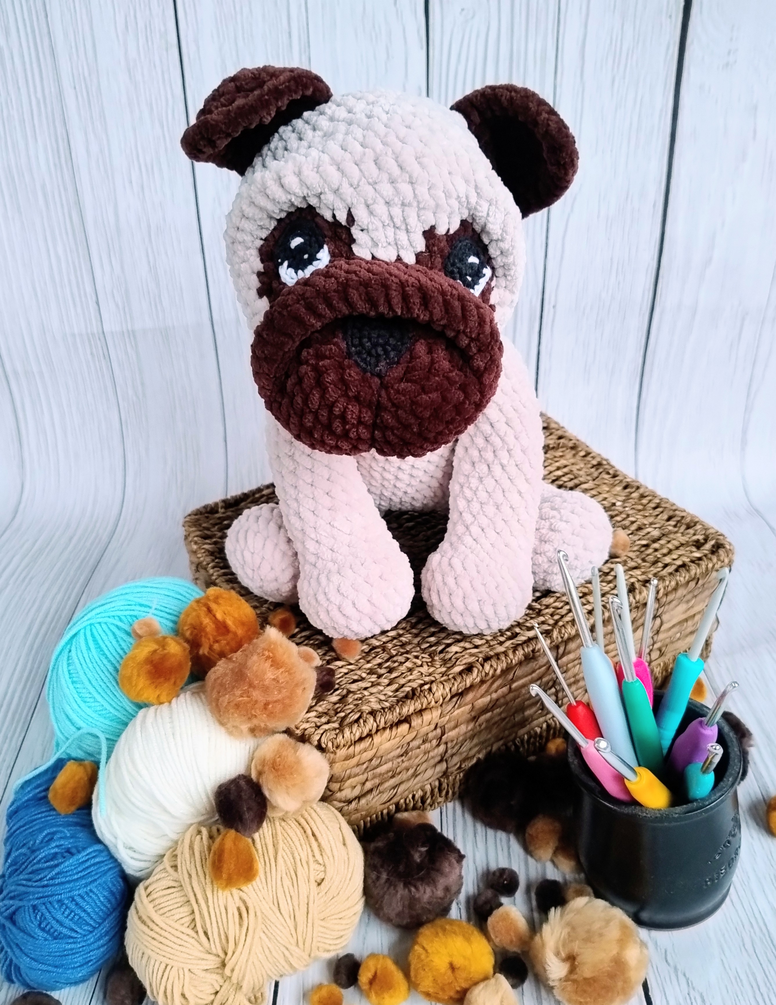 MOPS – włóczka pluszowa, wys.24cm (siedzący)/33cm (na stojąco). Cena 189zł