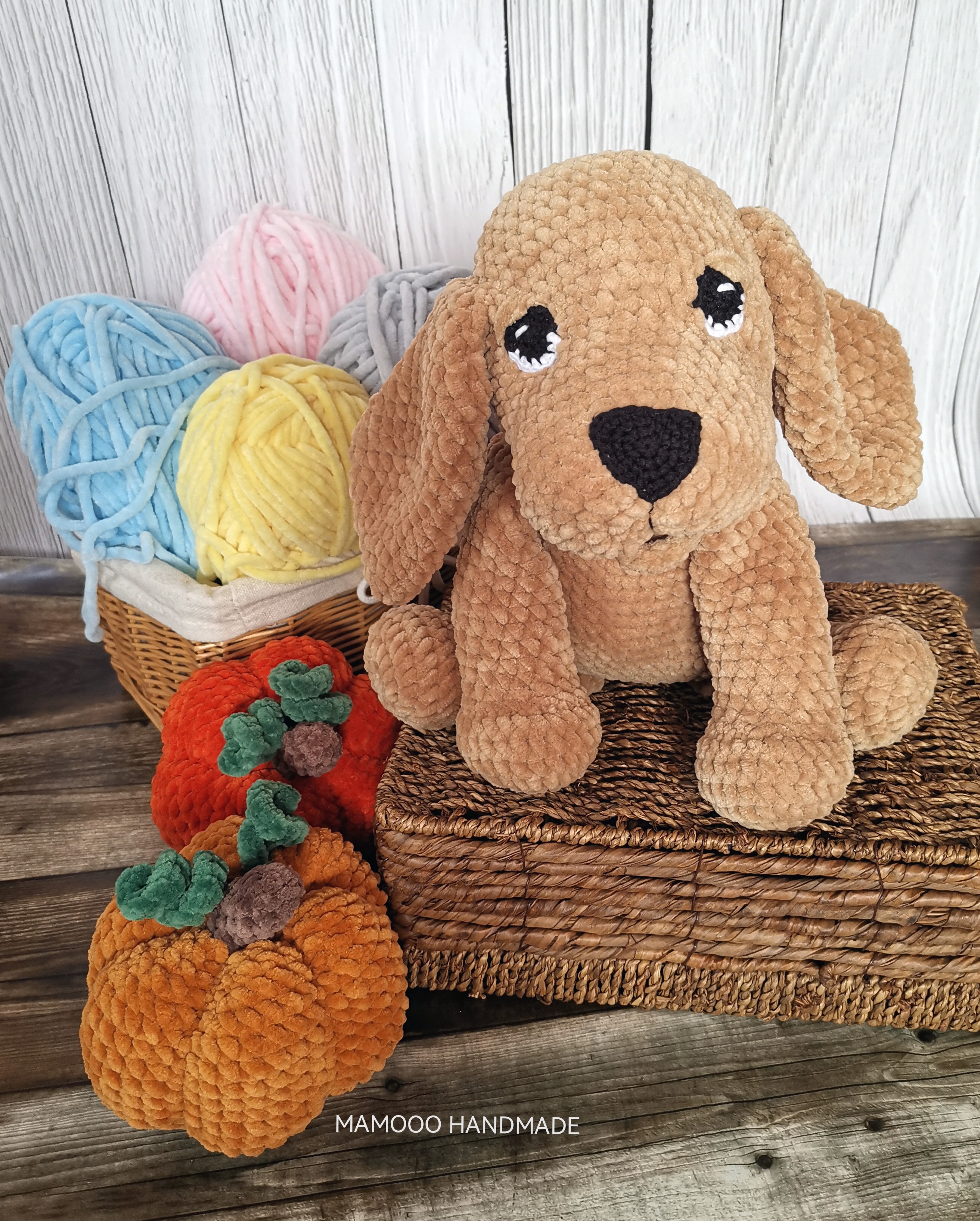 PIES TOFFIK – włóczka pluszowa, wys.24cm (siedzący)/33cm (na stojąco). Cena 189zł