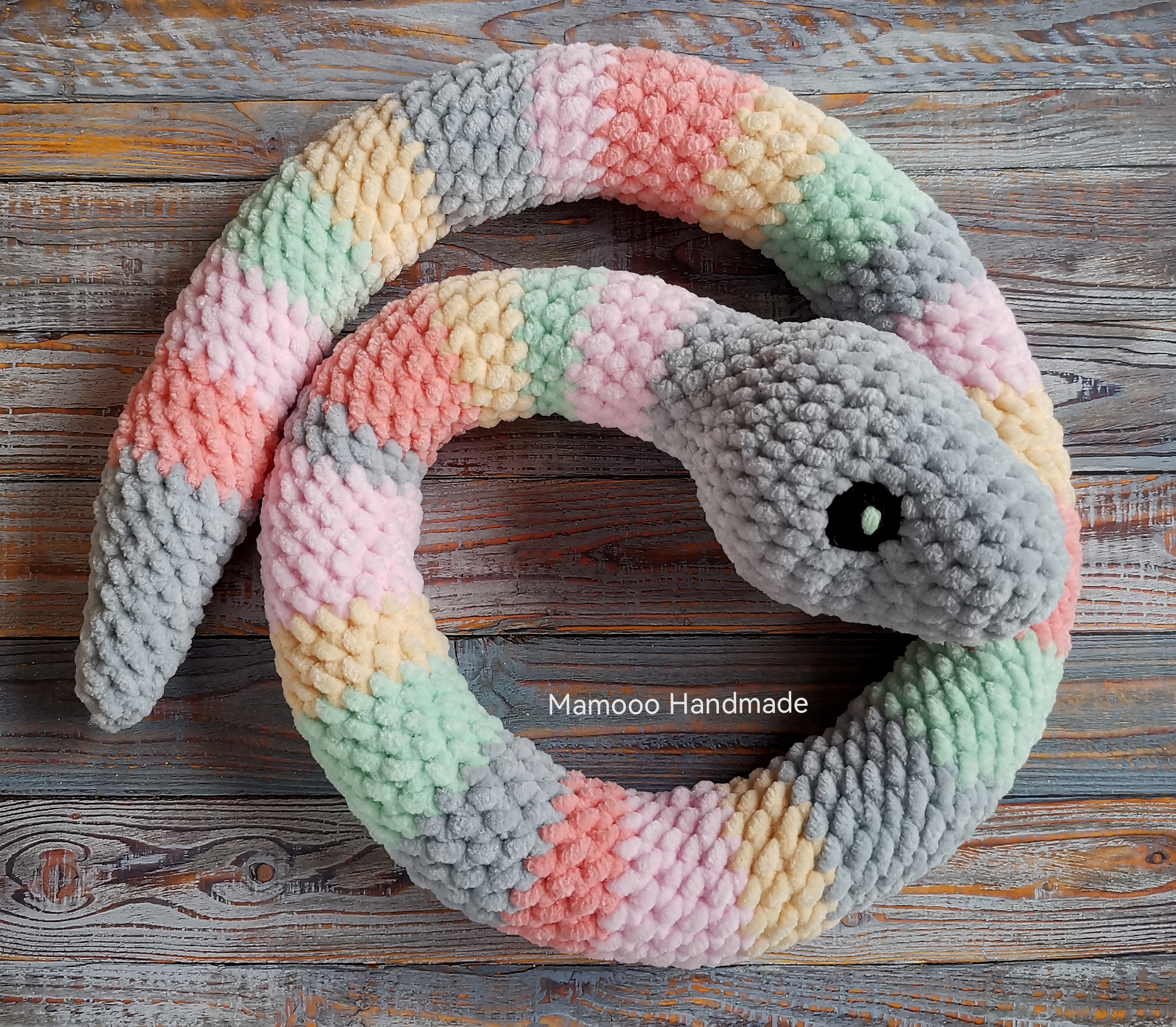 WĄŻ – włóczka pluszowa, długość ok. 110 cm. Kolorystyka dowolna – wg zamówienia. Cena 130zł