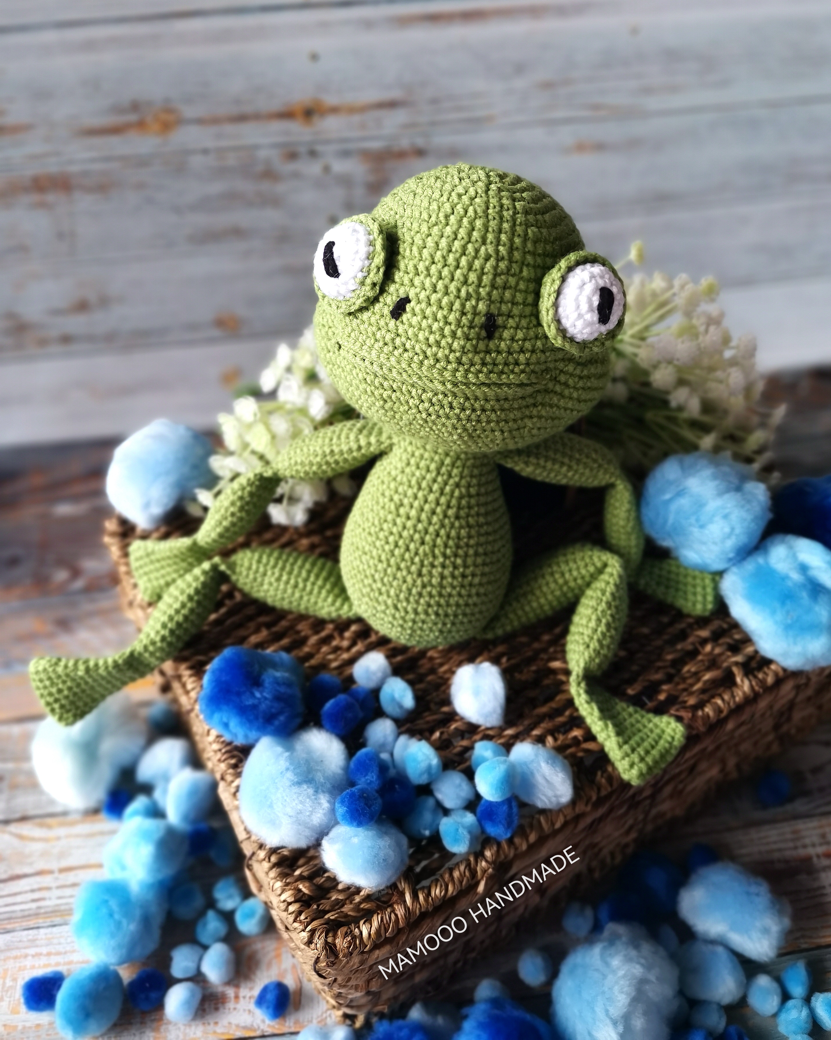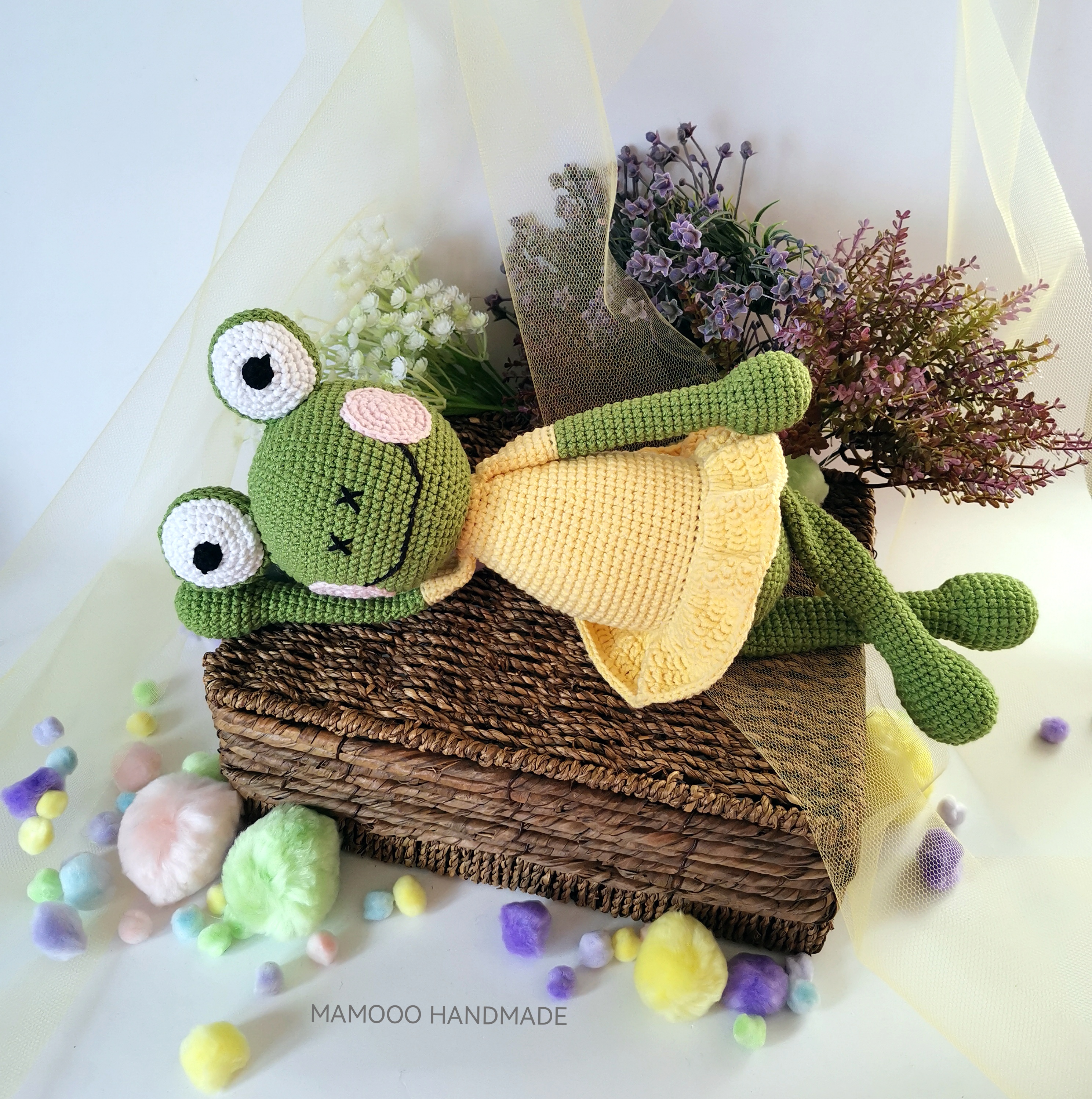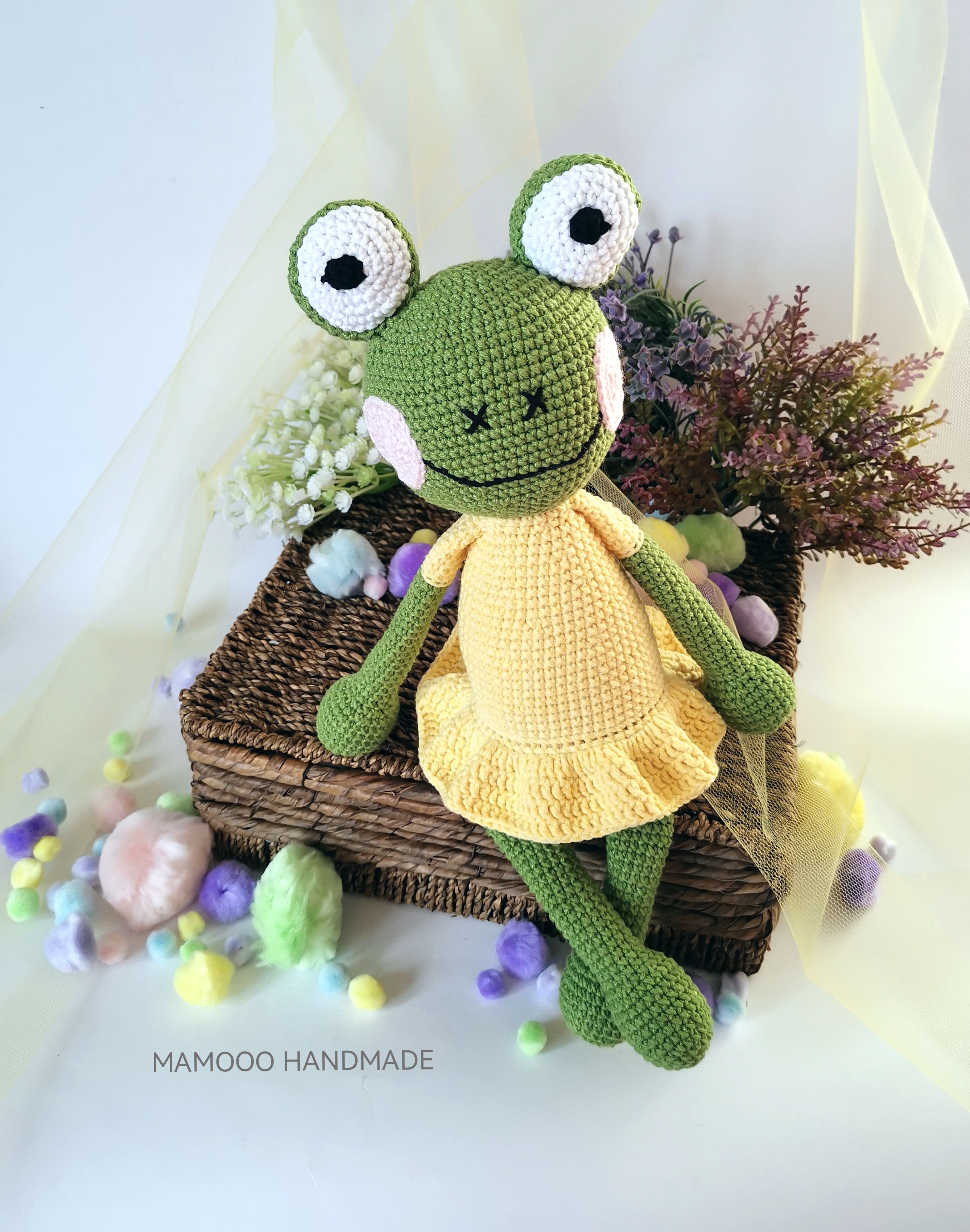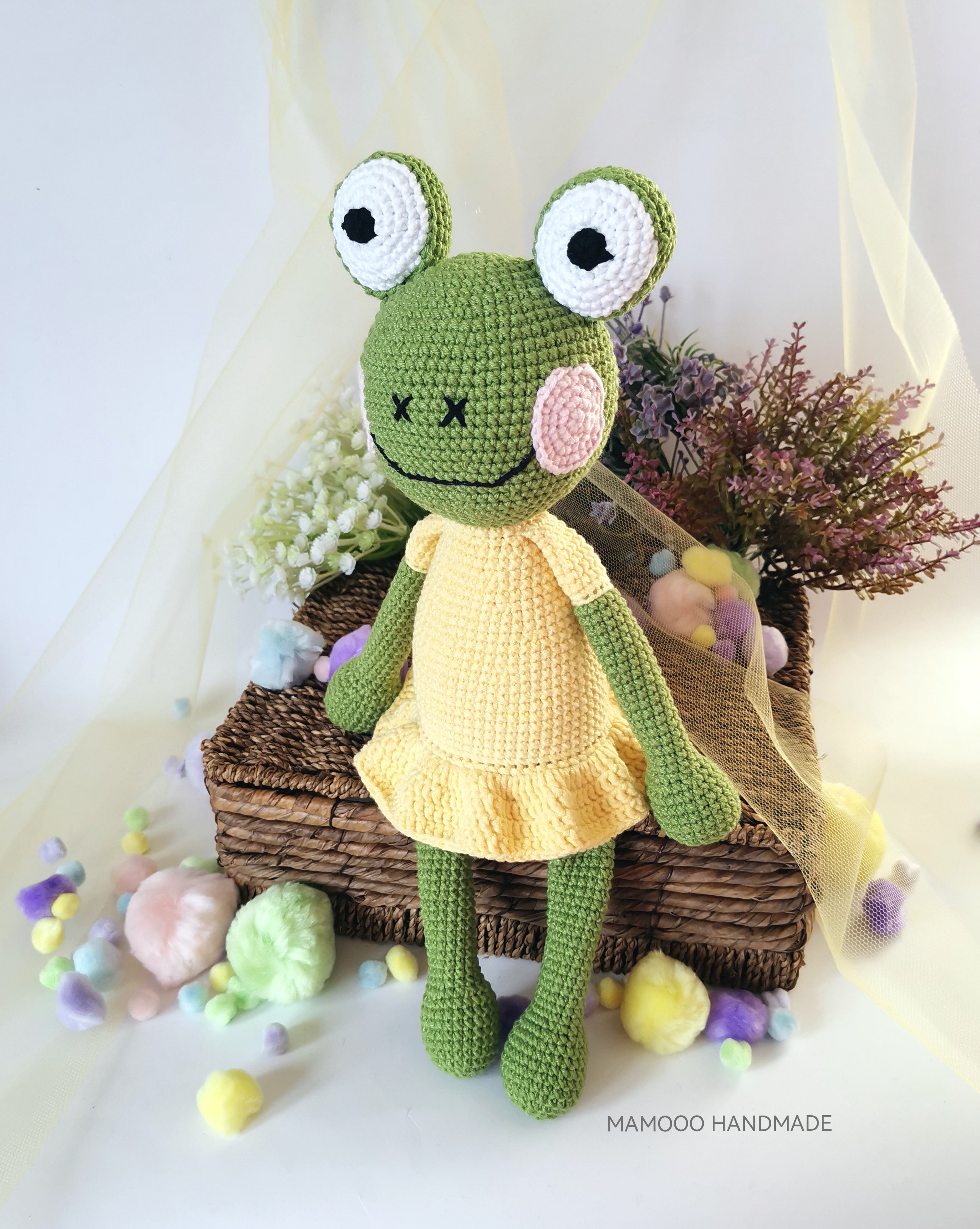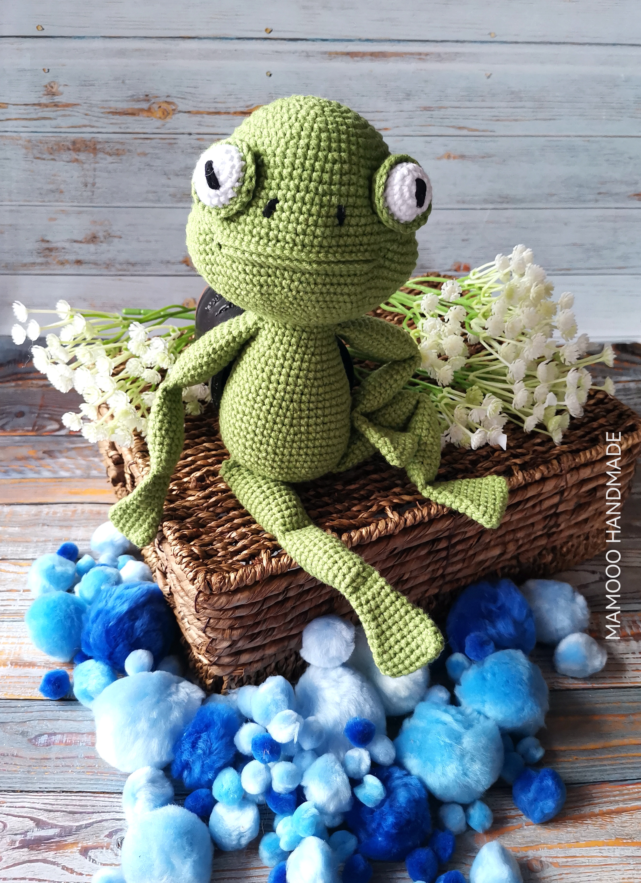 ŻABKA MONIA – wysokość ok. 33cm, cienka włóczka bawełna+akryl, różna kolorystyka. Cena 200zł
