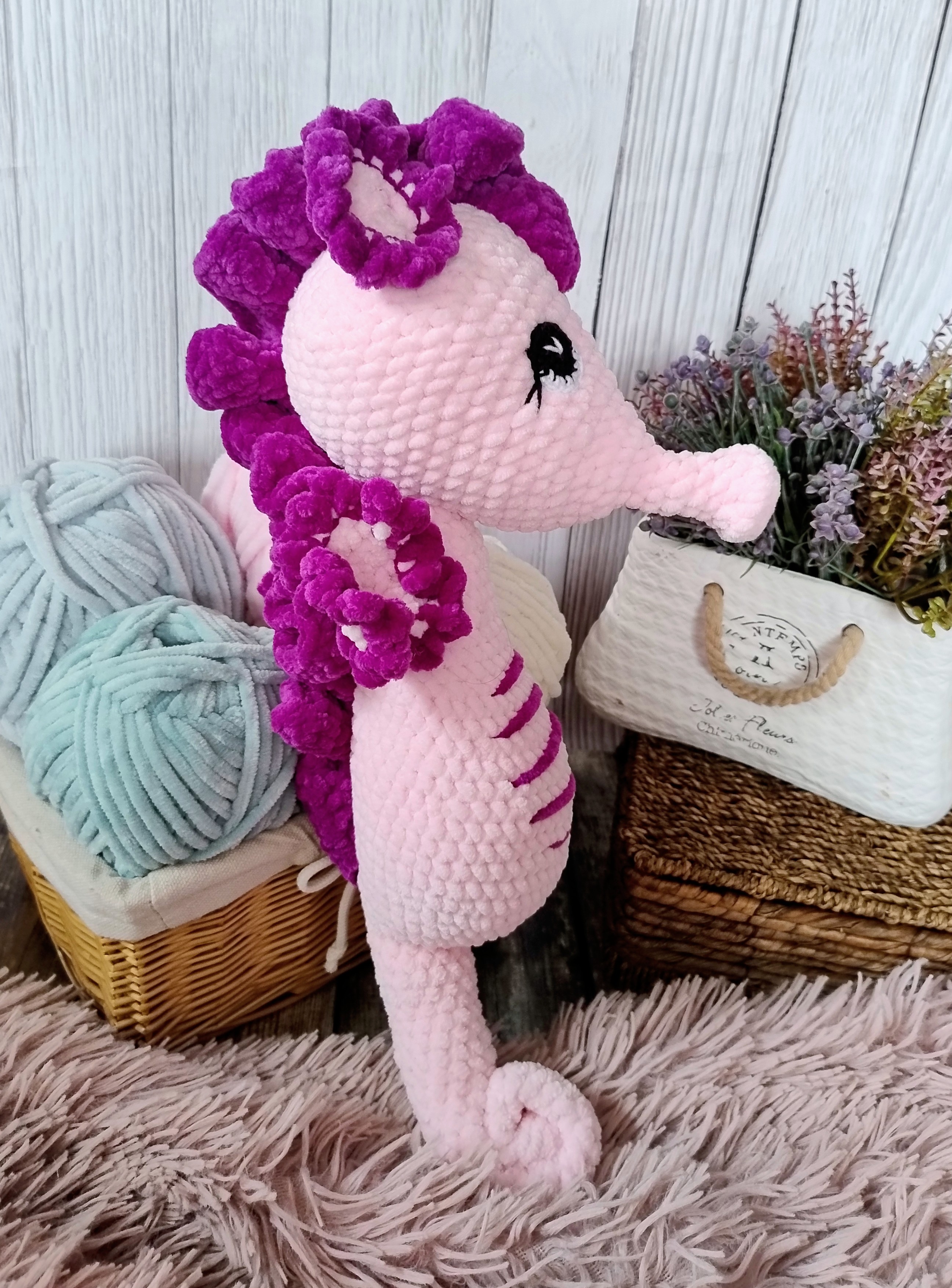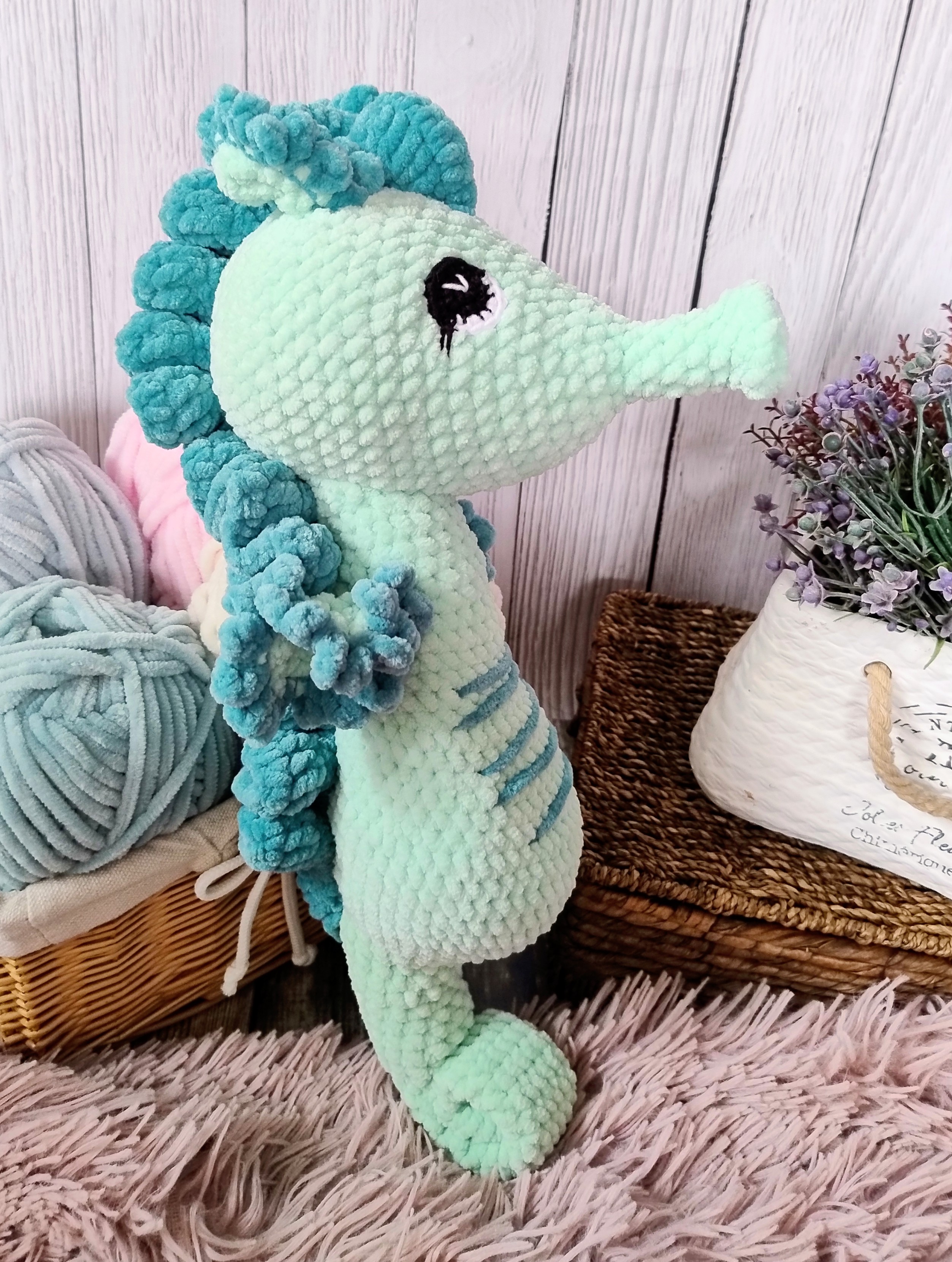 KONIK MORSKI – wlóczka pluszowa, wysokosć 40cm, różne kolory. Cena 160zł