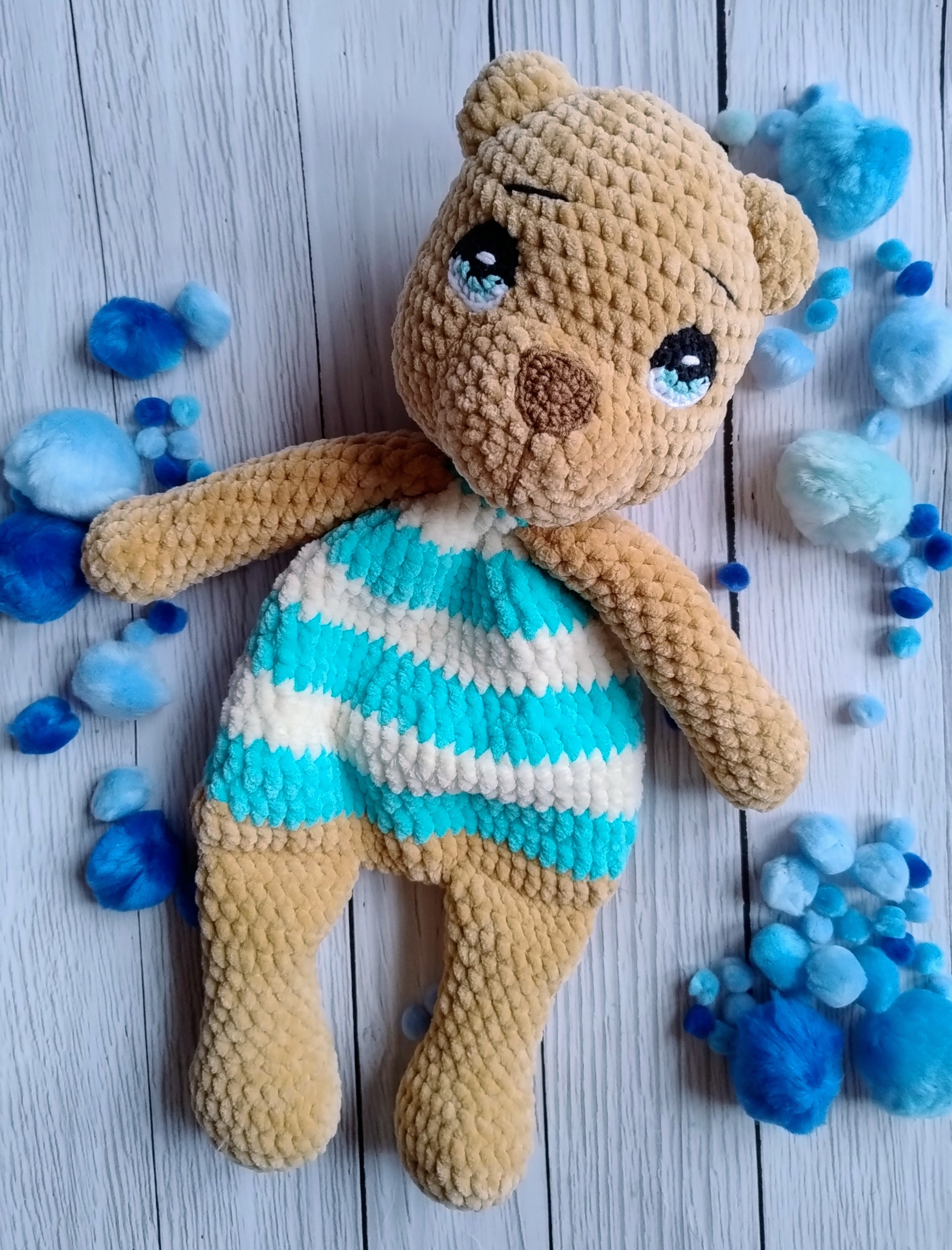 Miś LULI – ok. 38cm, włóczka pluszowa, pusty brzuszek, różna kolorystyka. Cena 159zł