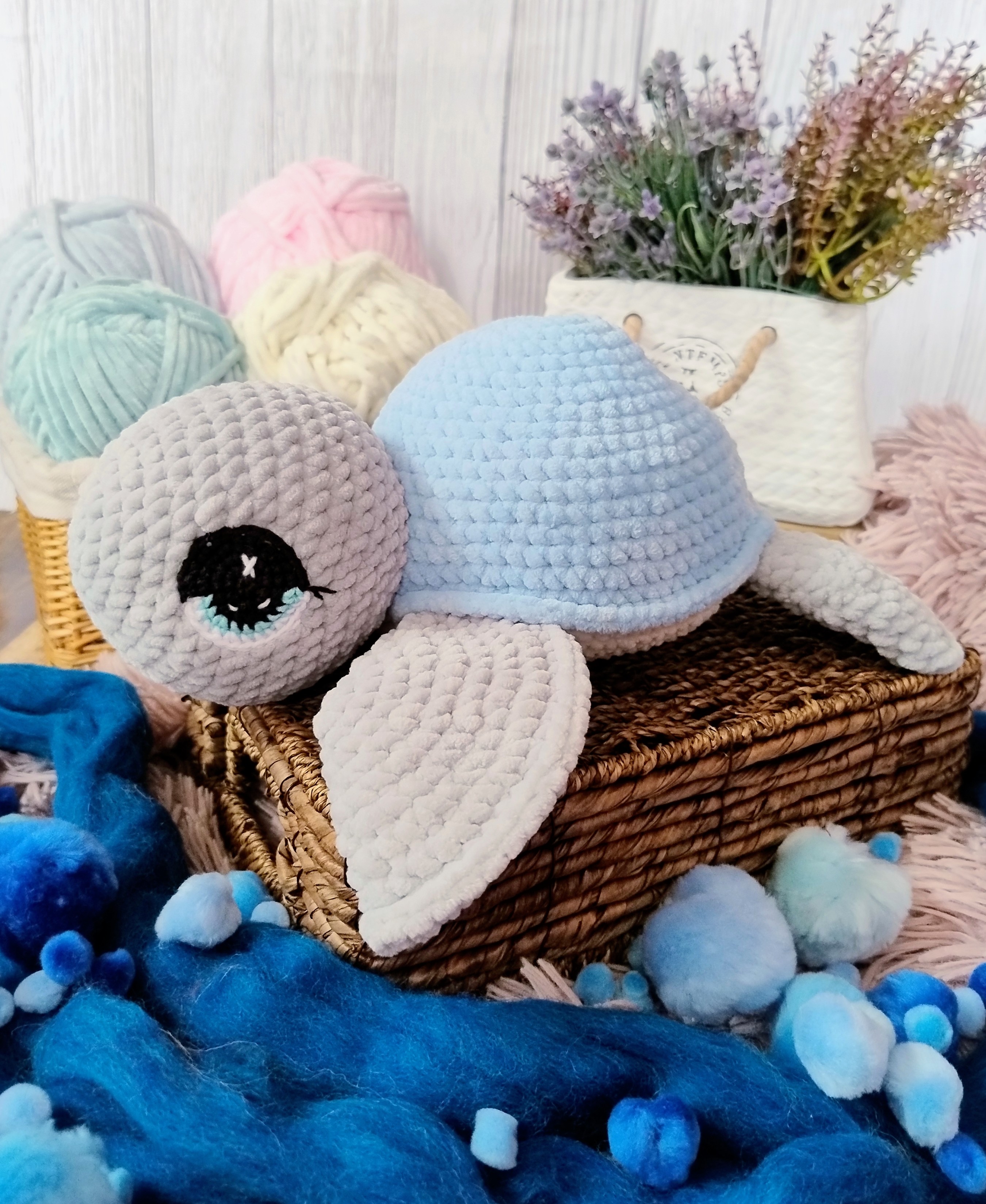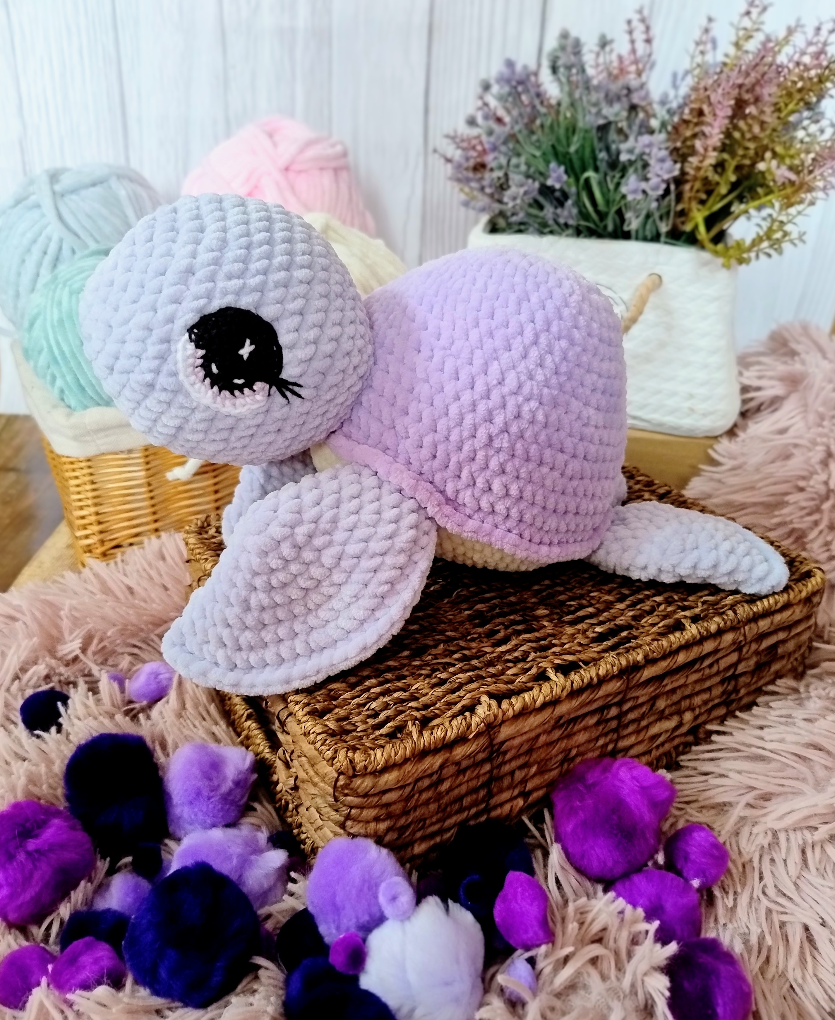 Żółw – włóczka pluszowa, różna kolorystyka, długość ok.26cm. Cena 160zł