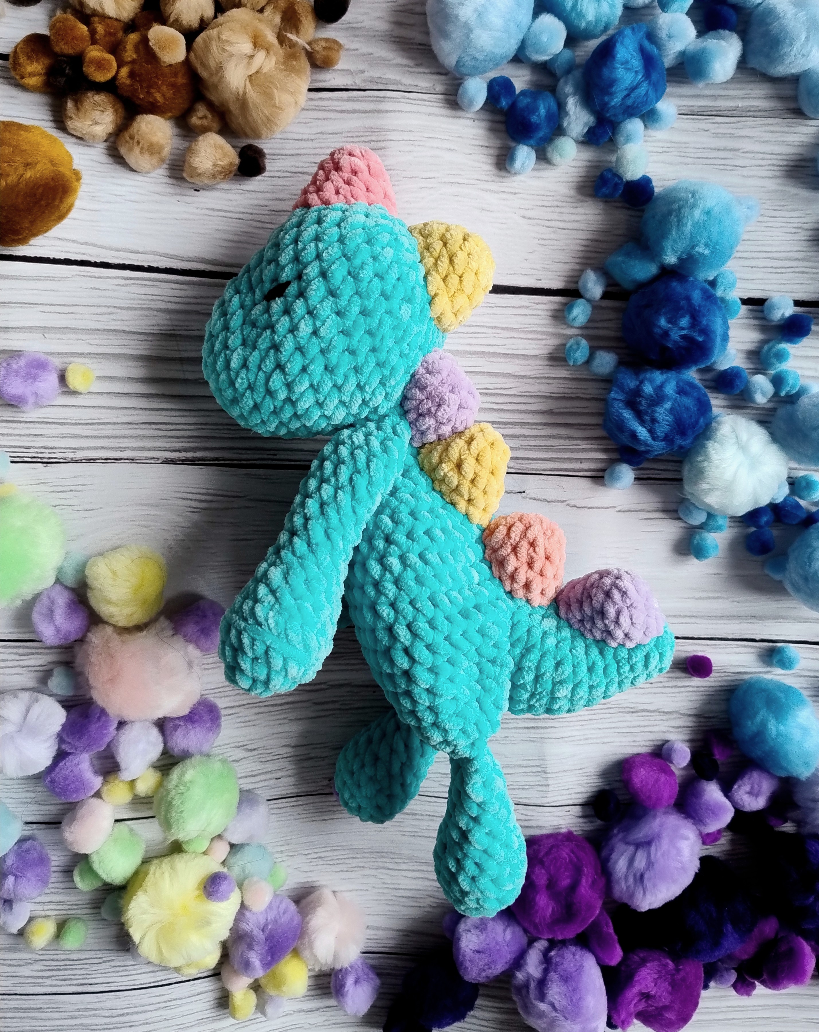 Dinuś Luli – wysokość ok. 29cm, włóczka pluszowa, lekko wypełniony, różna kolorystyka. Cena 135zł